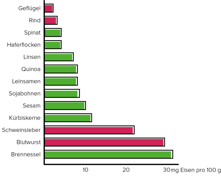 Bei einem Vergleich, wie viel Milligramm Eisen pro 100 Gramm in den Lebensmitteln steckt, schneiden die pflanzlichen Lebensmittel besser ab, als die tierischen. Außer der Schweineleber, die mit getrockneter Hefe am meisten Eisen mit 18 g enthält, liegen Lebensmittel, wie Weizenkleie (16 g), Kürbiskerne (12,5 g), Sojabohnen (9,7 g), Linsen, Hirse und Tofu unter anderem, vor tierischen Produkten, wie Leberwurst (3,3 g), Schweinsschnitzel (1,7 g) oder Appenzeller Käse (0,3 g).
